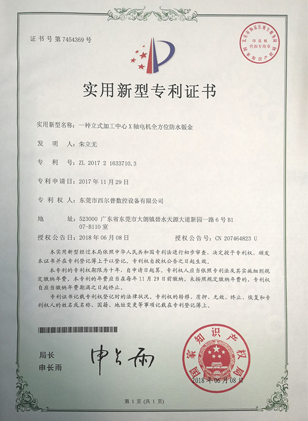 一種立式(shì)加工中心(xīn)X軸電機全(quán)方位防水(shuǐ)钣金證書(shu)